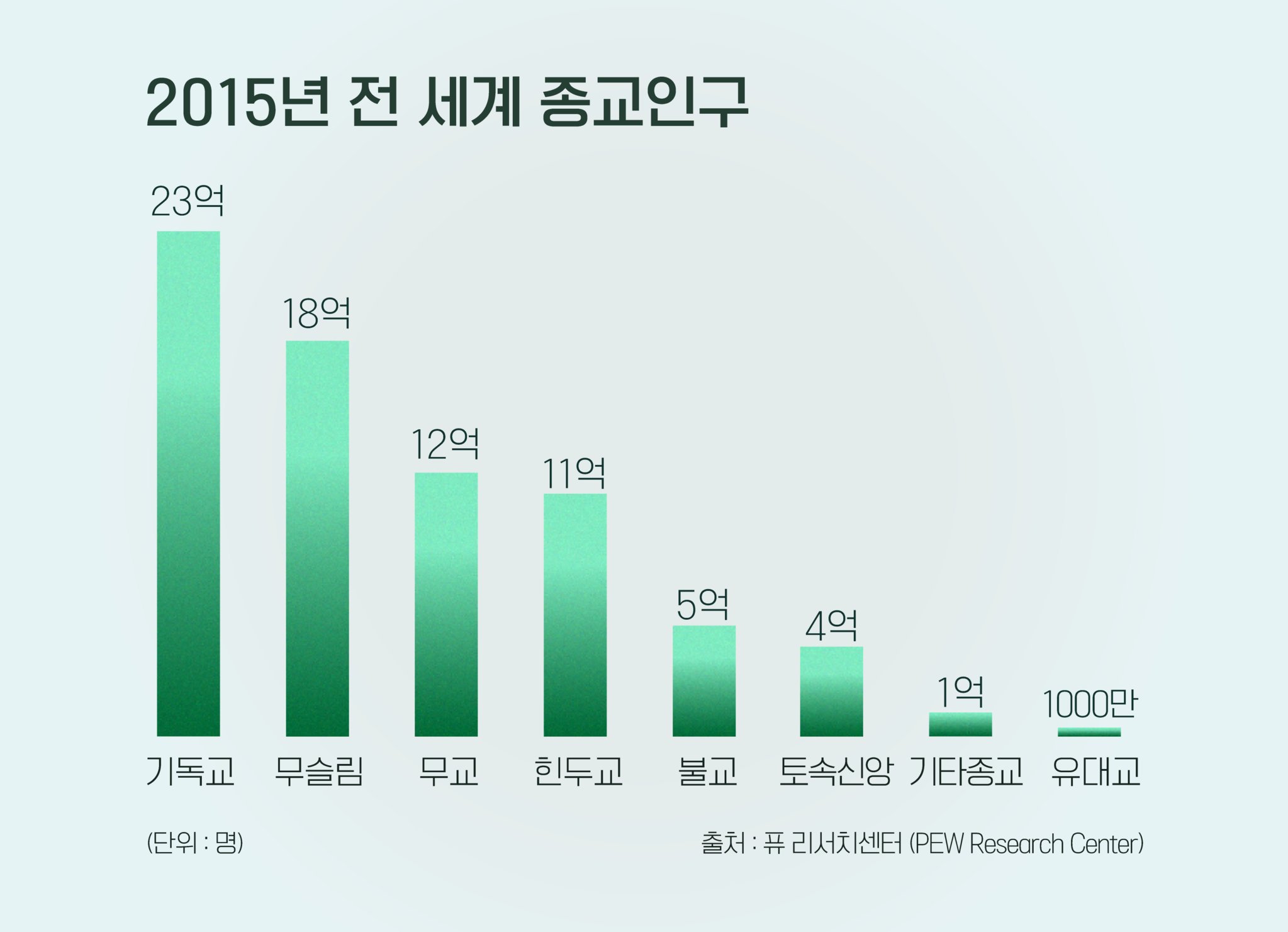 이슬람은 세계에서 두 번째로 신도가 많은 종교입니다. 미국 통계조사기관 '퓨리서치센터(PEW Research Center)'에 따르면 2015년 기준 전 세계 무슬림 인구는 18억명으로 집계됐습니다. 가장 규모가 큰 기독교(22억명)과 신도 수 차이는 5억명 정도입니다. 신도 수가 늘어나는 속도가 빨라, 2035년에는 이슬람 신자 수가 기독교를 초월할 거라는 전망도 있습니다.
