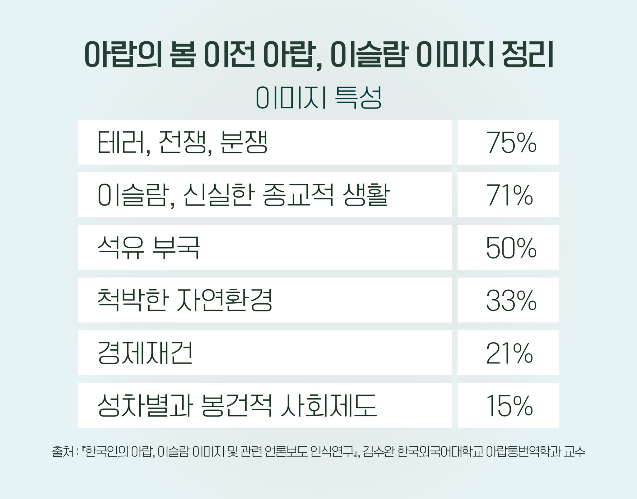 실제로 우리 사회의 많은 이들은 이슬람교를 테러·전쟁 등의 부정적인 이미지와 연관 짓고 있습니다. 김수완 한국외대 아랍통번역학과 교수가 발표한 '한국인의 아랍, 이슬람 이미지 및 관련 언론보도 인식연구'(2016년 『한국중동학회 논총』)에 따르면 설문에 응한 성인남녀 563명 중 75%가 아랍·이슬람을 테러·전쟁·분쟁·위험한 지역 등의 부정적 이미지로 떠올렸다고 합니다.
